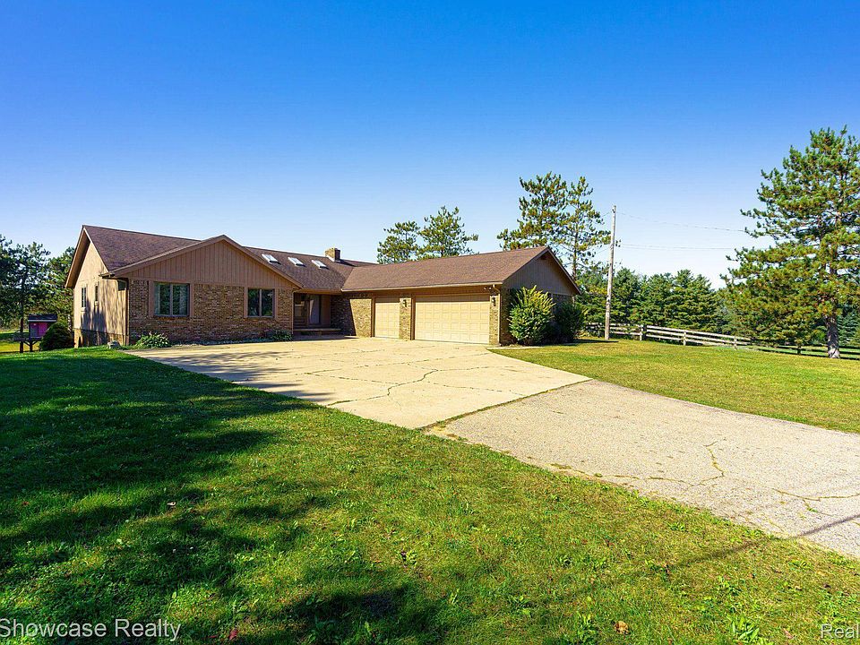 Finally, a Ranch home in Clarkston on Acreage!!! You walk into this beautiful Brick Ranch home and see the most fantastic Great Room with door walls, vaulted ceilings, skylights, and a gorgeous fireplace. You can feel how well-built this home is when you walk through it. The Primary Bedroom is large, and also has a door wall to sit on the deck and sip coffee in the morning. It is so peaceful here, I wanted to stay. The walkout basement is finished with 2nd kitchen and two flex rooms for crafting or office. Enjoy a total of 4400 sq ft of fabulous home. There is an attached three-car garage, a pole barn, a stable with 7 stalls, a tack room, a shed, and a playhouse. There is plenty of room to roam. The village will allow two splits on the property.