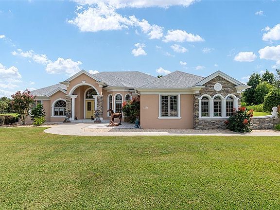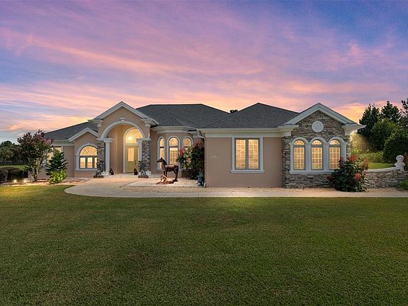 Luxury Pool home on 1.34 acres in SE Ocala — zoned A1 with NO HOA! This beautifully reimagined 4-bedroom, 3-bath estate showcases more than $600,000 in high-end upgrades and timeless design, all set in the heart of horse country just minutes from downtown. From the moment you arrive, the curb appeal impresses with stacked-stone accents, stately columns, and a grand double-door entry that sets the stage for the elegance inside. Soaring coffered ceilings, layered trim, and premium tile flooring. An elegant formal sitting room with arched windows and custom millwork offers a welcoming space for guests, while a private office provides the perfect work-from-home option. The chef’s kitchen is the heart of the home with quartz countertops, custom cabinetry, premium appliances, and a spacious island designed for entertaining. The primary suite is a serene retreat with private pool and lanai access, complemented by a spa-like bath boasting dual vanities, a freestanding soaking tub beside a double-sided fireplace, and a designer walk-in shower. Additional conveniences include a well-appointed laundry room with custom cabinetry, quartz-style counters, utility sink, and folding station. Peace of mind comes with a fully paid solar panel system, Generac whole-home generator, Kinetico water filtration system, custom Closets by Design, NEWER ROOF (2022), NEWER HVAC (2024), and custom blinds throughout. Fresh interior and exterior paint add to the home’s modern appeal. Outdoors, relax in the saltwater pool with new paver decking, cook in the fully equipped summer kitchen, and enjoy the lush landscaping and upgraded irrigation system. With its A1 zoning and no HOA restrictions, this estate combines modern luxury with the freedom and lifestyle that makes Ocala living truly exceptional. *NEW POOL!*