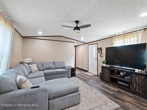Set amid a peaceful, lightly wooded neighborhood, this charming mobile home offers a comfortable and inviting retreat surrounded by nature. With two bedrooms and two full bathrooms, the home blends cozy living with practical design in a serene setting. The exterior features light gray vinyl siding with white skirting, a paved drive with a gravel extension for additional parking, and a spacious front yard shaded by mature trees that add privacy and a natural touch. Step inside to an open-concept living room filled with soft natural light from multiple windows, complemented by recessed lighting, a ceiling fan, and neutral finishes that make the space feel airy and welcoming. The adjoining kitchen showcases a functional U-shaped layout with wood-finish cabinetry, light laminate countertops, and a seamless connection to the living area—perfect for everyday convenience. The dining area features warm-toned laminate wood flooring, recessed lighting, and a glass-paneled door that leads outside, allowing easy access for morning coffee or evening relaxation. The primary bedroom offers a peaceful retreat with laminate flooring, beige wall panels with dark trim, and direct access to a private en suite bathroom featuring wood-pattern vinyl plank flooring and soft overhead lighting. The second bedroom and full bathroom are equally comfortable, providing versatility for guests or a home office. A separate laundry room adds extra functionality with wood-pattern flooring and ample space for storage. Outside, the rear entry features a small wooden staircase and railing leading to an open backyard surrounded by greenery, offering plenty of room for outdoor activities, a garden, or a quiet sitting area to enjoy the Florida breeze. The home's lightly wooded surroundings create a sense of privacy while still being part of a friendly residential area. This property is conveniently located close to The Villages, where residents can enjoy shopping, dining, and year-round entertainment. Also nearby is Carney Island Recreation and Conservation Area, featuring nature trails, picnic areas, and fishing spots along scenic Lake Weir, and Lake Weir itself, known for its clear waters, boating, and lakeside restaurants. Offering both peaceful country living and access to nearby conveniences, this mobile home provides the perfect balance of comfort, simplicity, and connection to the natural beauty of Central Florida.