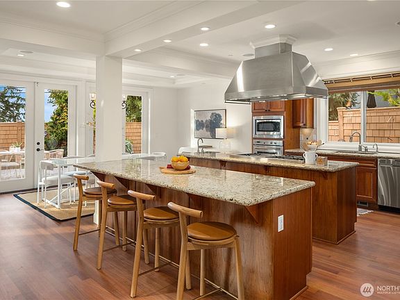 Every detail of this stunning Houghton residence blends elegance and comfort. The chef’s kitchen is the centerpiece of this home with six-burner gas range and grill, 3 ovens, wine fridge, dual granite islands with breakfast bars, two sinks, and walk-in pantry. Recently refreshed with new paint inside and out, refinished hardwoods on main floor, and a resurfaced balcony. This well kept home includes an office, game room with pool table, theater, and flex space. The primary suite offers vaulted ceilings, gas fireplace, balcony with Lake Washington views, spa-inspired bath, and an oversized custom walk-in closet. Enjoy built-in surround sound, tiled patio, hot tub, turf yard, and proximity to parks, schools, shopping and downtown Kirkland.