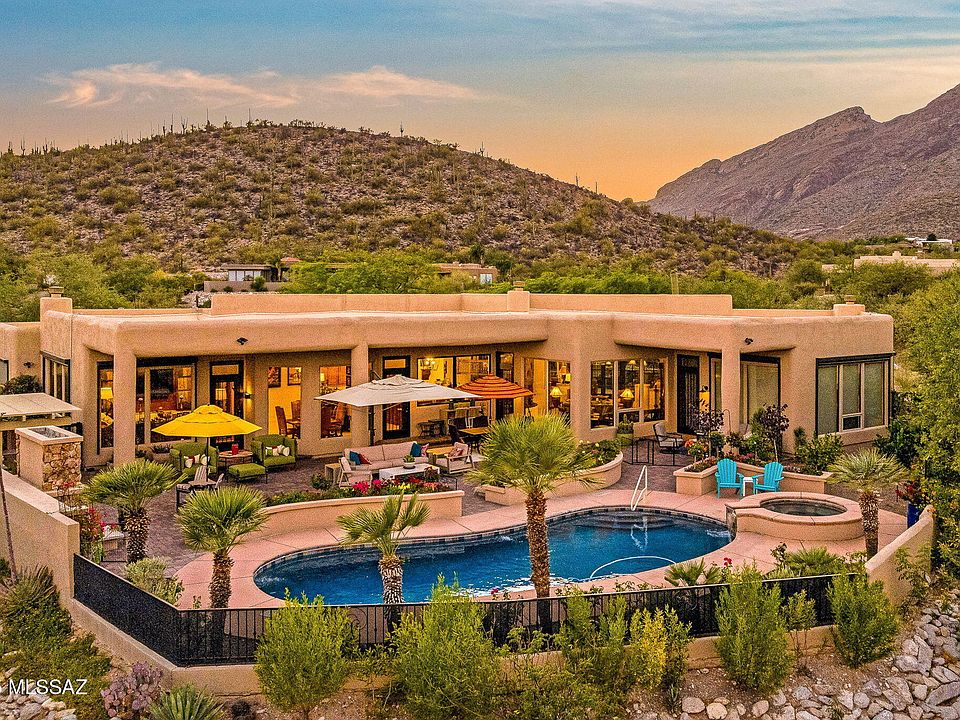 Welcome to The Crown Jewels Estate, where panoramic views sweep across the Catalina Foothills and the glittering city lights sparkle below like a necklace of diamonds. This five bedroom, four bath estate is more than a home. It is a masterfully reimagined sanctuary that balances elegance, modern convenience, and timeless Tucson charm.Step inside to find every thoughtful upgrade already in place. From the brand new resealed roof to custom iron security doors, solar shades with remote control, and a tankless Rinnai water system with a circulating pump, no detail has been overlooked. The kitchen is a true showpiece, completely redesigned with a relocated cooktop for functionality, a Viking range and microwave, dual Bosch dishwashers, beverage refrigerator, and striking quartz counters. Every appliance, fixture, and cabinet has been carefully chosen, soft close, and perfectly styled.