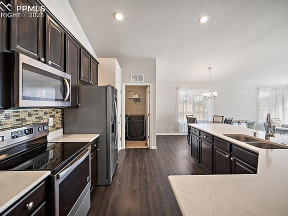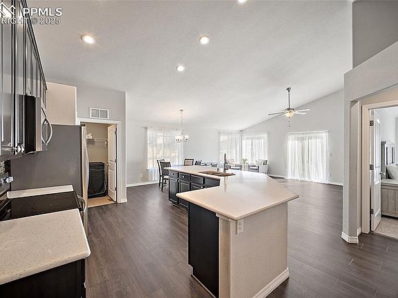 Welcome to this spacious single-family rancher in the desirable Lorson Ranch community. Built in 2019 and meticulously cared for, this home offers over 3,100 square feet of living space with main-level living and a fully finished basement. From the moment you step inside, you’re welcomed by an open-concept layout, vaulted ceilings, and abundant natural light that creates a bright and inviting atmosphere. The kitchen is the true heart of the home, featuring dark cabinets, light countertops, and an oversized island perfect for cooking, entertaining, or gathering. The living areas flow seamlessly, and with five bedrooms and three full bathrooms, there’s plenty of room for everyone. The spacious primary suite provides comfort and privacy, while the basement expands your possibilities with huge recreation rooms, tons of storage, and brand new carpet. Outside, the fenced backyard offers a blank canvas with space to make it your own, while the 3-car garage provides ample parking and storage. Located in Lorson Ranch, this well-kept community offers parks, open spaces, and trails, with quick access to shopping centers, military bases, and major highways. This home is the perfect blend of style, space, and convenience—ready for you to make it your own.