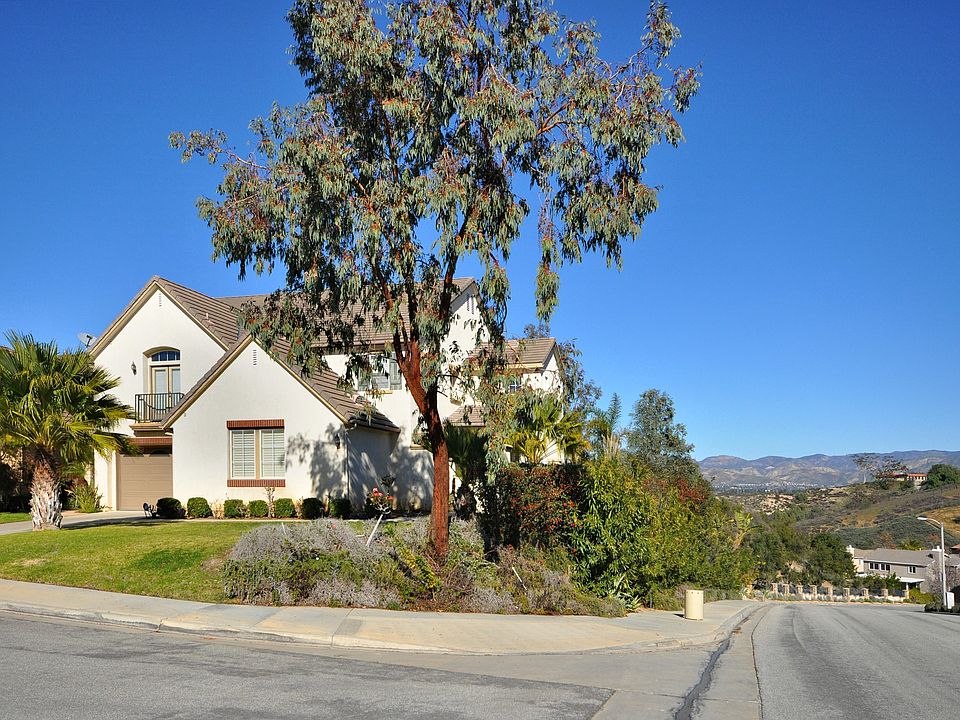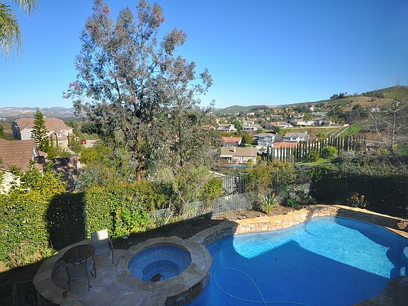 Hadleigh Hills view home built in 2002. 4 bedrooms, 3 bathrooms, custom pool and spa with room to play. Formal living room, Formal dining room, large family room, separate breakfast area with doors that lead outside. Vaulted ceilings, wood-like floors throughout down stairs, custom base moldings, beautiful kitchen, with granite type counters, center island, stainless steel appliances, huge walk in pantry and separate laundry room with sink. One bedroom/den and one bath downstairs, 3 bedrooms and two full baths, and a large loft/family room upstairs. The Master bedroom has views, a sitting area, large bath with separate shower and tub, double sinks and two walk in closets. The home is located on a cul-de-sac with plenty of parking and a three car garage.