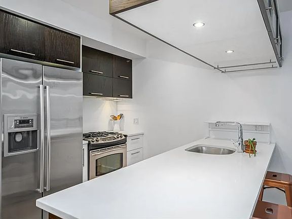 On the upper level, you're greeted by a spacious and bright living room that opens to your extraordinary 1,127-square-foot garden, the perfect setting for seamless indoor-outdoor living and entertaining. The open chef's kitchen impresses with snow-white quartz counters, a large pantry and a wide breakfast bar. A bedroom suite on this level offers garden views, two roomy closets and direct access to a large bathroom with a frameless glass tub/shower and floating vanity surrounded by handsome large-format tile.