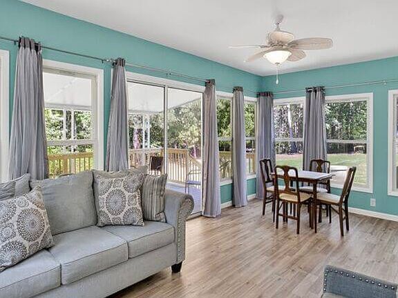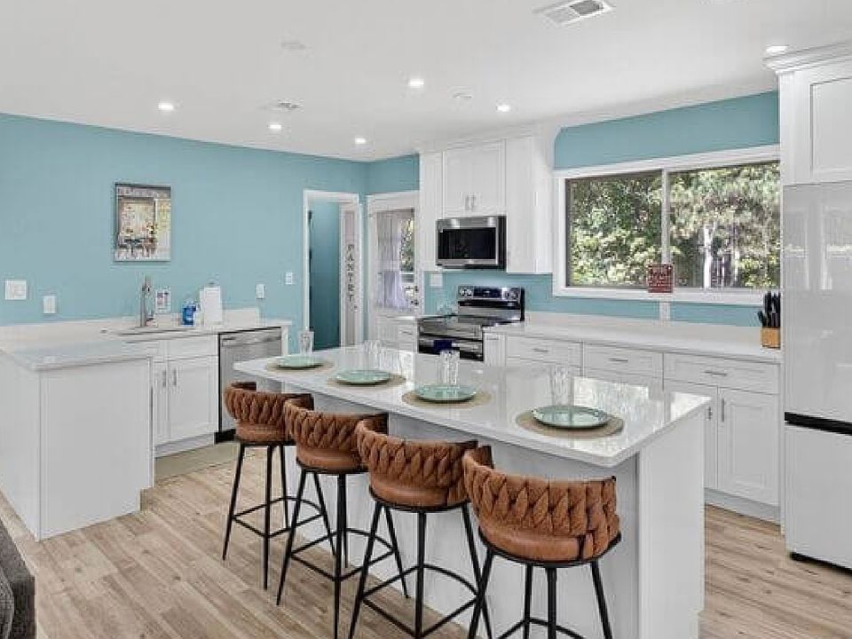 The living areas are cozy and if renting furnished they are well-equipped, with multiple Samsung TVs, streaming options, wireless internet throughout, and games for family fun. Step outside to enjoy a screened porch, an expansive fenced backyard, and a shaded garden area. For recreation (if renting furnished), the property includes a driveway basketball goal, a volleyball net, and a garage transformed into a game room with ping pong, darts, air hockey, and children's toys.