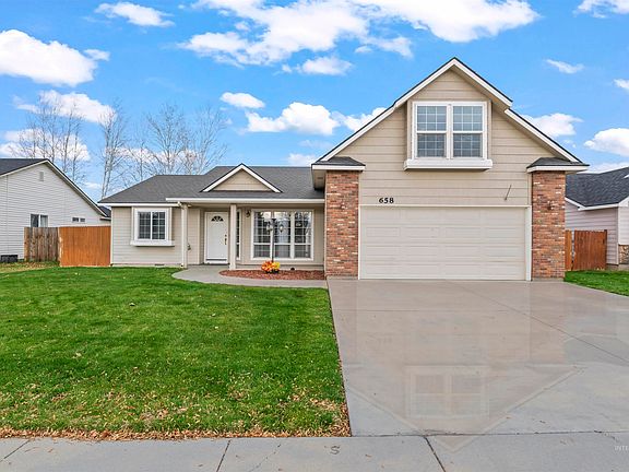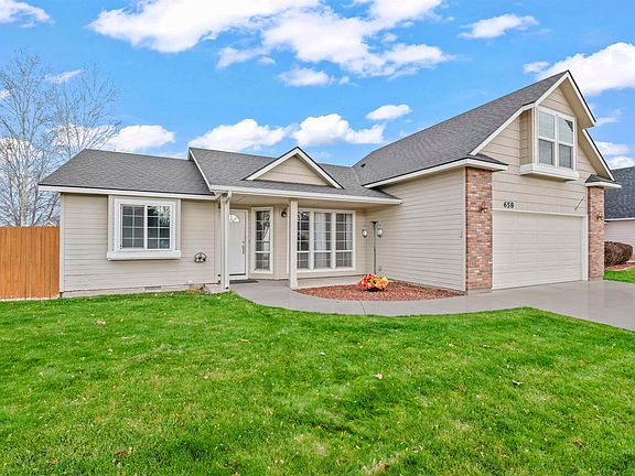 Quality construction defines this 3-bedroom, 2-bath, 1,556 sq ft home with a spacious bonus room, located in the established Wild Meadows neighborhood of custom homes. Set in a quiet yet convenient Kuna location, it offers close proximity to local amenities, a neighborhood park, and a dog park just a half mile away, along with easy access to Swan Falls, the Snake River, and Indian Creek. A covered front patio provides an inviting space to enjoy Kuna’s renowned sunsets, while the back patio is enhanced by a retractable awning for comfortable outdoor living. Inside, the split-bedroom floor plan offers privacy, while the vaulted great room is filled with natural light from large front windows and anchored by a striking corner gas fireplace. The kitchen and dining area feature a breakfast bar, large pantry, and upgraded appliances, creating a functional and welcoming space. Main living areas have been recently repainted and updated with luxury vinyl plank flooring. Additional upgrades include new windows, a sliding glass door, and a newer HVAC system. The generous upper bonus room offers exceptional flexibility and could easily serve as a fourth bedroom, office, or media space. Surrounded by mature landscaping, this thoughtfully maintained home blends comfort, quality, and an exceptional Idaho lifestyle.