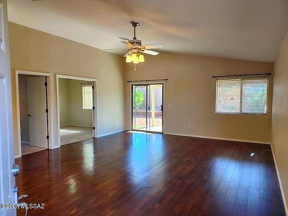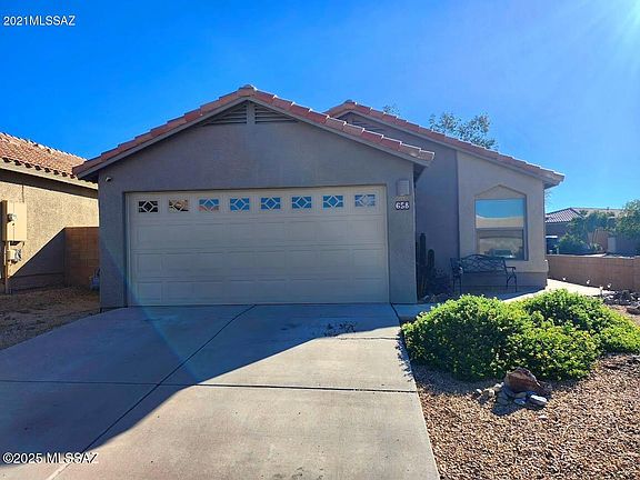 Discover your dream home on a spacious corner lot in the family-friendly Santa Rita Ranch! This well maintained 3-bedroom, 2-bath home features a high-quality tile roof and a bright, open kitchen with gas range/oven and a pass-through breakfast bar, perfect for entertaining. The primary suite offers a walk-in closet and dual sinks, while the versatile 3rd bedroom with French doors can serve as an office, den, or family room. Step into the expansive living room that flows seamlessly to a covered patio and beautifully landscaped, low-maintenance backyard, complete with two shade sails creating a private outdoor retreat. Additional highlights include dual-pane windows, a finished 2-car garage, and placement in the Vail Unified School District, all within a quiet, welcoming neighborhood. Swing in backyard does not convey.