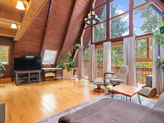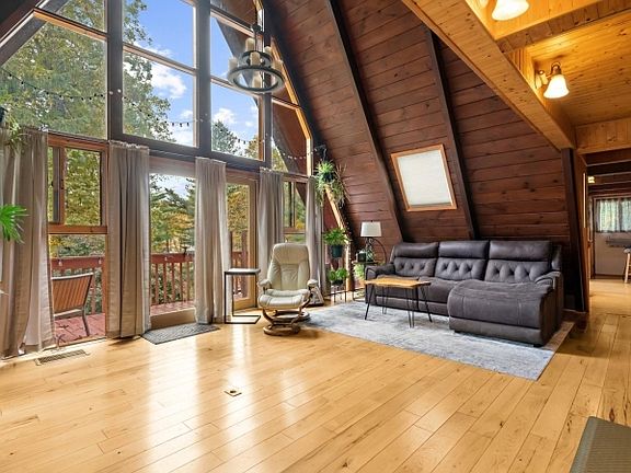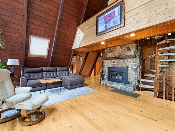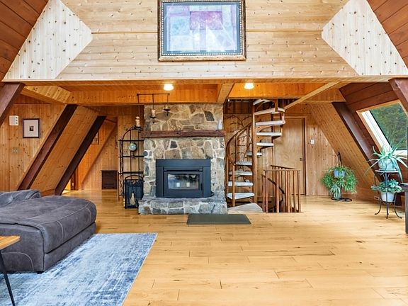 Looking for something different? Escape to a 4 BR, 2.5 Bath A-frame Alpine Chalet that offers privacy and tranquility in abundance! Nestled on 1.5 wooded acres, this home offers beautifully updated kitchen & baths, hardwood floors in Living Room, Breakfast Room & Bedrooms, 2 stone fireplaces, (1 w/new surround and both with hi efficiency inserts). Soaring dramatic cathedral ceiling in Living Room. Primary Suite is a private enclave with newer carpeting, gorgeous views, huge separate dressing room/closet, private bath with heated floor, soaking tub and stall shower. Updated electric and newer roof, 2 car garage with opener, outdoor fireplace, and a wrap-around deck. Large laundry room, even a laundry chute! All appliances, including generator are included. Home Warranty included. Enjoy hiking and fishing in the nearby Columbia Trail and Ken Lockwood Gorge. Don't miss this one!