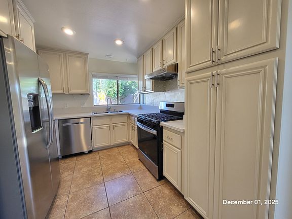 Beautifully updated single-story featuring an open floor plan, vaulted ceilings, and modern finishes throughout. Bright kitchen offers stainless-steel appliances, gas range, solid-surface countertops, and ample cabinet space. Spacious primary suite with private backyard access, dual-sink vanity, and generous closet storage. Updated secondary bath with tub/shower combo. Low-maintenance yard with mature palms, citrus tree, patio space, and outdoor storage shed. Freshly updated interior lighting, flooring, and neutral paint. Move-in ready and well maintained! Single-Family