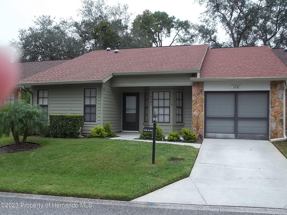 ACTIVE UNDER CONTRACT-ACCEPTING BACK UP OFFERS. TIMBER PINES villa ready for a new owner. Laminate and ceramic flooring, granite counter tops, eating counter, ceiling fans, solar tubs, stainless steel appliances, whole house water softener, open floor plan with lanai under heat and air for an additional 132 sq ft of living area.