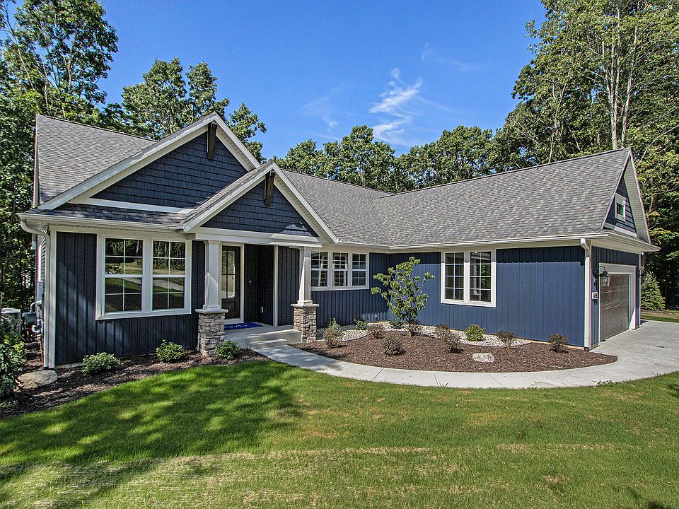 The Ranch at Hidden Lake is one of the most beautiful parcels of land in southwest Michigan! This 2025 parade home is nestled on the last exclusive opportunity for a new construction walkout home in this premier community, you will love living among beautiful trees in this captivating ranch style home! The high end finishes exude timeless charm and boasts exquisite well designed features. With a large 4099 sf floor plan,an abundance of natural light, and meticulously crafted details, this residence offers the perfect blend of style and comfort. No detail forgotten in this luxurious entertaining-centric home! Luxury appliances, custom closets, high end designer finishes in every nook and cranny - don't miss the dog room with their own walkout entrance made for the most pampered of pooches The main level primary suite is a luxurious retreat - soaking tub, designer tile, and even built in towel warmers will make you think twice about ever leaving the comfort of home. The spectacular wooded views from every angle, and spacious deck overlooking the gently sloped backyard add to the feel of your own permanent retreat. The community park features private lake with dock access, pickleball courts, walking trails, sports courts, and dog park - perfect for active families!