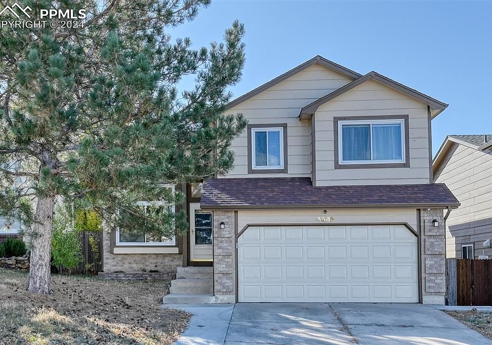 This move in ready home located in the desirable D-49 Constitution Hills neighborhood is ready for it’s next owner and is available for a quick close! This charming 3 bed, 3 bath, 2 car garage, four level home features a brand new roof and gutters (2024), a freshly painted interior AND exterior (2024), brand new carpet (2024), newer radon mitigation system (2019), garage door and garage door opener (2020), water heater (2024) and stainless steel stove, microwave and dishwasher (2024). The main level features a spacious living room, vaulted ceilings, engineered hardwood floors and large windows to provide plenty of natural light. The thoughtfully laid out upper level features a master suite with vaulted ceilings and attached 5 piece master bathroom as well as 2 additional bedrooms and an additional full bathroom. The lower level features a large family room with a beautiful gas fireplace, a half bathroom, access to the garage, as well as sliding glass doors that walk-out to a fully fenced back yard with a 12x10 shed. The unfinished basement has tons of potential and would be perfect for a workshop, craft room, or a great opportunity to add a fourth bedroom and bathroom utilizing the existing rough-in. This home is in a great location and conveniently located within walking distance to a neighborhood park, close to shopping and dining opportunities along the Powers corridor, and is also an easy drive to Peterson AFB, Schriever AFB and provides a convenient commute to Ft. Carson.