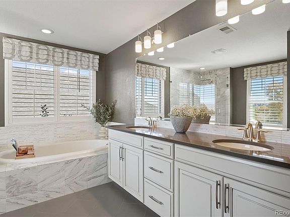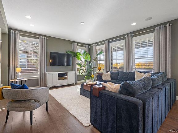Wake up to mountain views and the serenity of open space just beyond your backyard in this stunning former model home located in Pinery West! This home blends luxury and livability, featuring a chef-inspired kitchen, dedicated office, theater room, 3-car garage, and unforgettable Colorado sunsets. The kitchen showcases upgraded cabinetry, quartz countertops, double ovens, gas cooktop, wine fridge, a large center island, and a walk-in pantry. It opens to the inviting living room with a dual-sided fireplace that extends into the show-stopping dining room anchored by a beautiful crystal chandelier. Upstairs, the spacious primary suite offers dual walk-in closets and a luxurious 5-piece spa-inspired bathroom. Two additional bedrooms, a loft, and the laundry room complete the upper level. Throughout the home, you’ll find built-in speakers, upgraded finishes, and a dual-zone HVAC system for year-round comfort. The finished basement is designed for entertainment and includes a 4th bedroom (theater room), home gym, full bathroom, and a large game area with custom bar. The insulated, heated 3-car tandem garage offers a hot and cold interior faucet and abundant storage. Outdoors, relax or entertain on the covered patio and enjoy the hot tub overlooking mature trees along the Cherry Creek Trail. Golf cart access connects directly to The Pinery Country Club just minutes from door to door. This exceptional home offers the very best in comfort, design, and lifestyle.