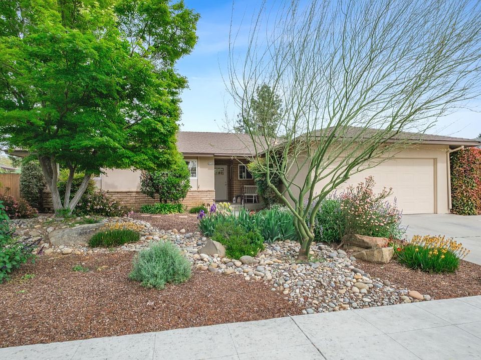 This home features bamboo hardwood floors, a spacious living room, an open family area with a gas fireplace insert, updated kitchen and dining room. There are four bedrooms and two renovated baths, plus a master suite with patio access to a Bullfrog spa and pool with a new variable speed pump and robotic cleaner. The low-maintenance landscaping includes fig, lime, and Meyer lemon trees. Additional highlights are a new Tuff Shed, relatively new high-efficiency HVAC system, owned solar panels, and new garage opener and stainless-steel utility sink. Located in a quiet cul-de-sac near Rotary East Park (new pickleball courts), shopping, and Fresno State orchards (for dog walking and exercise). Close to Fresno State, shopping, movies, and FOOD!! Purchase includes: washer, electric dryer, dishwasher, stove/oven, microwave