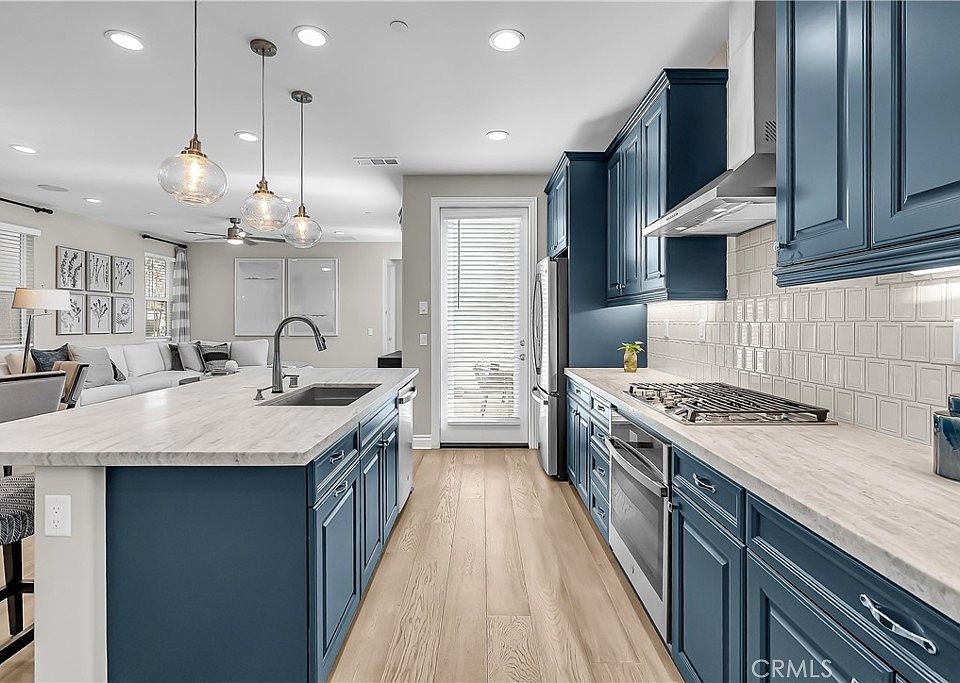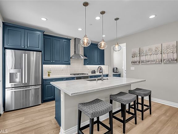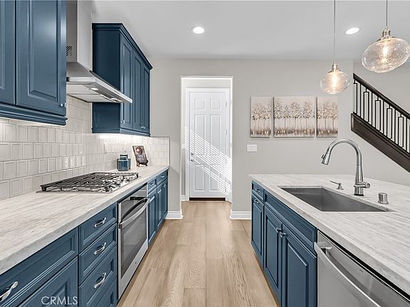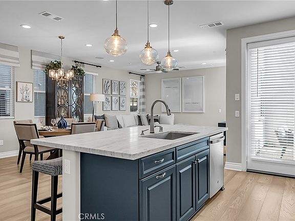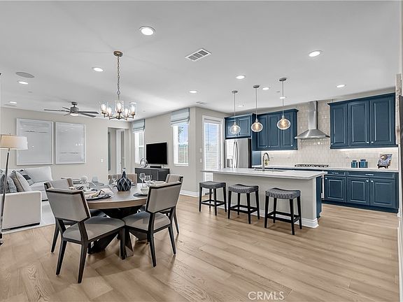 Highland Park – Former Model - Designed as the exemplary iteration of the popular Norcroft floor plan, this is not an average production home. The professional interior design elements, along with curated upgrades throughout, enhance this open floor plan that boasts a bedroom and full bath on the first floor. The gourmet kitchen serves as the focal point of the common areas, uniting design and function. Striking deep-blue cabinetry complements the stainless-steel appliance suite, full height backsplash, center island with leather finished marble. The same design theme continues to the butler’s pantry/coffee bar and walk in pantry that are conveniently ensconced in an alcove off the kitchen. Just beyond the kitchen, the light-filled family room offers large windows, recessed lighting, and warm wide-plank flooring creating a bright, welcoming atmosphere. Up the custom banister and handrail, the second floor continues to impress. At the terminus of the staircase, a large loft with built in desk awaits. The primary suite sits on the opposite side of the 2nd floor from the secondary bedrooms, allowing for privacy. The primary suite is an opulent affair with a spa-like ensuite bath and walk-in closet. Two more bedrooms and a laundry room(w/sink) complete the second floor. Outside, the home wraps the backyard patio, creating a private courtyard for entertaining or dining. The yard is fully landscaped with turf, trees, ornamental gravel, and a drip system. Value add items such as PAID solar, a whole house fan, 2 car attached garage, and a premium lot make this a must see. Highland Park offers robust amenities: pool, spa, clubhouse, playground, dog park, and gated entry. This one is a must see.