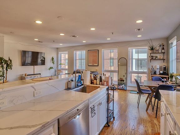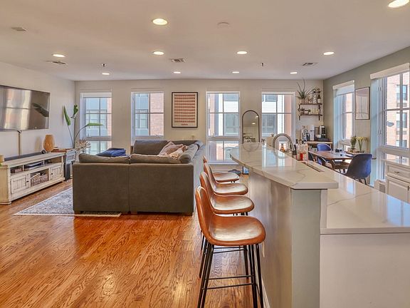 Welcome to Residence #406 at 659 1st Street. A sun-drenched 1 Bedroom corner unit located in the Harrison Court complex in vibrant Downtown Hoboken! Offering 937 Sq.Ft. this oversized home combines modern comfort with unbeatable city living convenience. Step inside to find an expansive living room with floor-to-ceiling windows that fill the space with natural light. Get a glimpse of the Empire State Building! Elegant oak hardwood floors flow throughout, creating a warm and inviting atmosphere. The open-style kitchen is perfect for entertaining, featuring stainless steel appliances, white granite, and a large breakfast bar island. Xtra large pantry ready to be fully stocked and deep hallway closet perfect for more storage. Recessed lighting in all the rooms. The spacious bedroom boasts double closets, while the beautifully appointed bathroom offers a granite vanity and sleek finishes. Enjoy the ultimate convenience with In-unit washer/dryer and central air. Harrison Court is a steel-and-concrete amenity building with gym, common courtyard, and rooftop patio. Located around the corner from the 2nd St. Light Rail station providing stress-free access to direct NYC transportation and all that Hoboken has to offer.