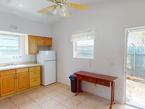 This backhouse includes a private, fenced patio with planting area (maintained by the tenant), open living/diningkitchen area, and vaulted ceilings. Kitchen includes plenty of cabinets, gas oven, built-in microwave, and refrigerator. Tile flooring throughout. Wall heater, window AC unit, and ceiling fan. Bathroom includes a shower/tub combo. Private stackable washer and dryer and hot water heater.