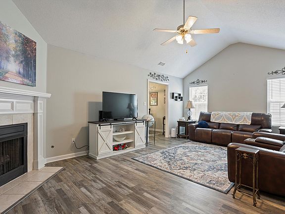 The kitchen boasts granite countertops and stainless-steel appliances, including a refrigerator, stove, dishwasher, and microwave, all from 2023. Both bathrooms also feature granite countertops. The living room offers a vaulted ceiling and a cozy gas fireplace, while the owner's suite includes a trey ceiling, walk-in closet, and en-suite bathroom.