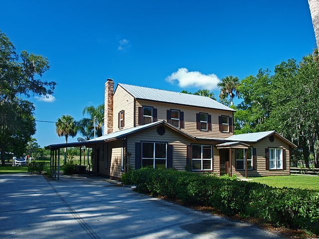 3 acres on St. Johns River! 200' on River. Super home with barn, workshop & outbuildings.Set up for horses!3 bedrooms + 2 rms that could be offices or addit'l bedrooms. Built for the views & sitting right on the River! Wonderful setting. Special from the minute you drive down the driveway between the 2 fenced pastures.Built in the Olde Florida Cracker style but with all the interior pizzazz of a new & updated home. Large kitchen with maple cabinets, concrete counters and all new stainless appliances.Family room, game room w media screen and windows looking out to porch & River! 13 x10 office or 4th bedroom (no closet) downstairs.9x9 upstairs hobby room plus 3 bedrooms. Master suite is 16x14 with 10x10 sitting room opening to balcony& the River. Master bath with whirlpool tub & marble vanities. Upstairs & downstairs porches & balconies-all right on the river. Outbuildings include 2 car garage with 24x17 office, 6 stall barn (1st class) with tack room, wash room and 34x40 workshop. Fruit trees, new well, A/C for up A/C for down. Boat lift 10K, seawall. Termite bond Terminex.