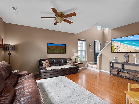 Immaculate 3-bedroom end unit with water views! This beautifully maintained home features new flooring throughout, a new roof and siding, and a spacious open-concept layout that's perfect for both relaxing and entertaining. The kitchen offers 42" cabinets, stainless steel appliances, and flows seamlessly into the bright living and dining areas. The generous primary suite includes a walk-in closet and private bath with double sinks and a glass shower. Enjoy serene pond views from your private patio, a finished garage with extra storage, and a peaceful location just steps from the neighborhood park. Truly move-in ready and a wonderful place to call home!
