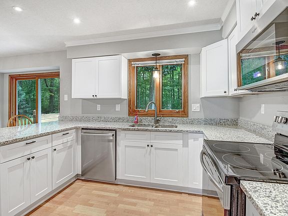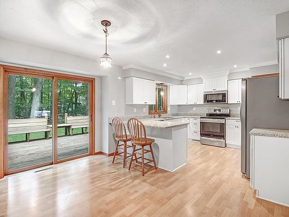 Opportunity to buy the ranch style house at the end of the subdivision with fantastic wooded views! Home features 3 bedrooms and 2 full baths that were both recently remodeled! Enjoy a brand new kitchen will all new white cabinetry, stainless steel refrigerator; recessed lighting and flooring. Living room has vaulted ceilings, fireplace, and plenty of room for furniture. Main floor laundry and mud-room of garage. Newer roof, furnace, A/C, & water heater. Backyard features a wood deck and beautiful setting with mature trees and great views! Garage is 21' 6'' deep and 21' 3'' wide.