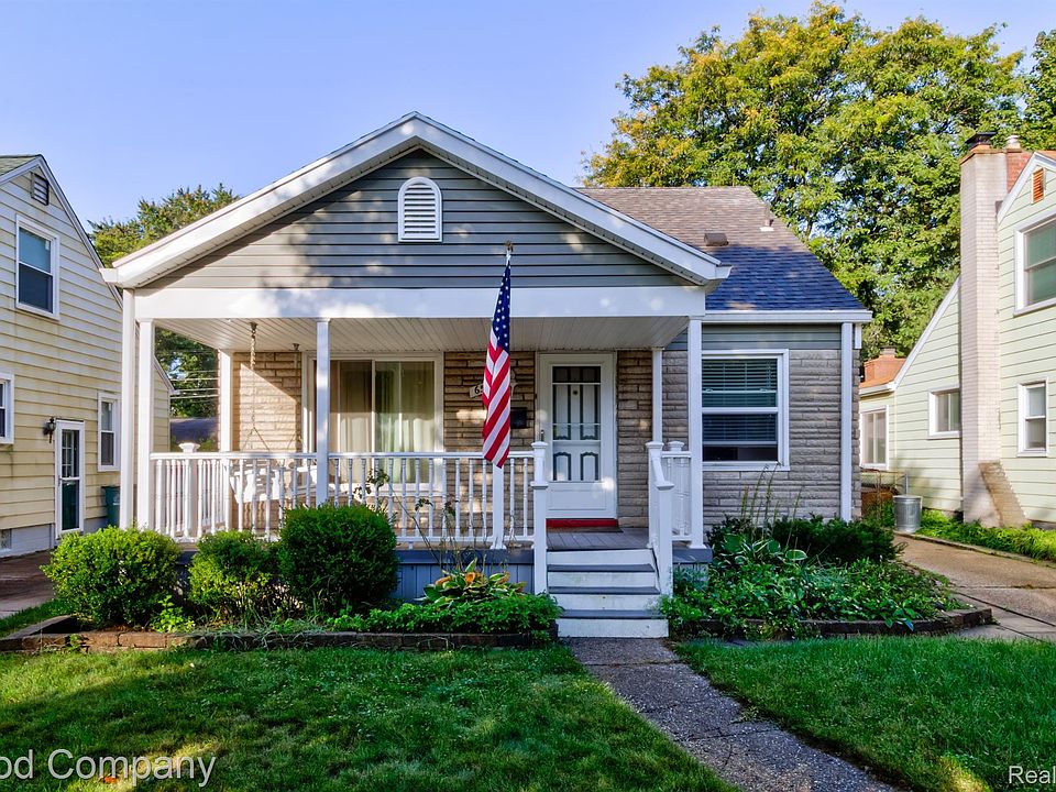 Fantastic Clawson bungalow features a beautiful interior with a roomy kitchen, large private primary suite, and partially finished basement. Enjoy a nice day on the covered front porch surrounded by garden beds. Light filled entry living room with coved ceilings and hardwood floors. Cute dining room opens to a large kitchen with plenty of cabinet and counter space. Two entry level bedrooms share an updated full bath down the hallway. Wonderful primary suite on the upper level with its own en suite full bath and walk-in closet. Partially finished basement provides a great bonus entertainment space, laundry, and storage. Fenced backyard with a patio and detached two car garage. Close downtown Clawson, walking distance to local parks, and easy freeway access. Welcome Home!