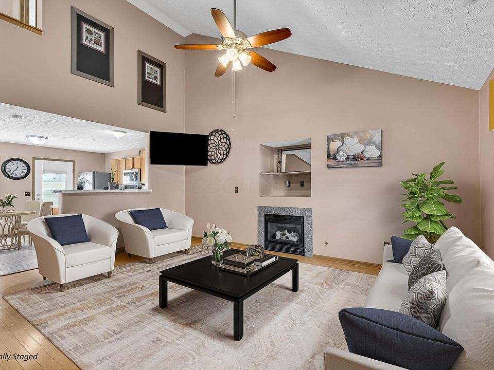 ***OPEN HOUSE Saturday (10/18) from 12 to 2pm*** NEW LISTING! Must see freestanding condo with first floor owner's suite and laundry. Real wood flooring, vaulted ceilings and cozy fireplace in the great room! The spacious kitchen w/ room for dining. Rear Patio. Detached 2 car garage. Utility room on the first level is spacious and handy. Lots of storage areas in the home. Covered lemonade front porch. NEW FURNACE in Feb 2025 and NEW Water Heater, just days old; New AC unit in 2020; bathroom remodel w/ Fresh Paint & New Carpet Upstairs 2022, where you will find 2 bedrooms (1 was formerly a loft) and a full bath. New Retractable Front Storm Door in 2025. Delaware Schools! Don't Delay! Request your Showing today!