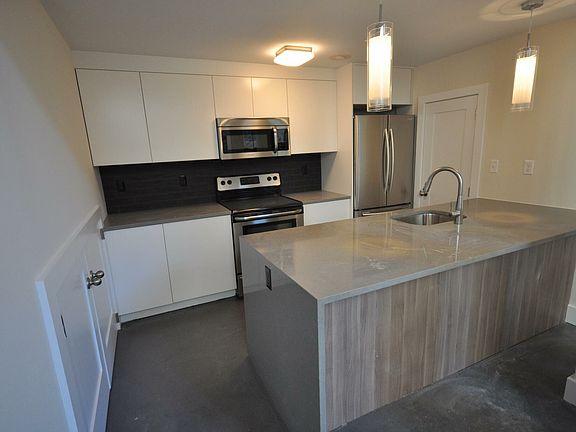 The two story entryway expands two stories with a cathedral ceiling in the main entry space. This lofted three bedroom apartment balances the historic character of the original industrial building with the contemporary modern finishes and amenities. The unit has high ceilings, exposed concrete floors, industrial steel railings, and is equipped with the latest in urban utilities. This large three-bedroom split-level apartment features a beautiful kitchen equipped with all new stainless steel appliances, granite countertops with waterfall ends, a garbage disposal, a dishwasher and a bar roomy enough to seat three. There is exposed brick in the main living room/ cathedral space.