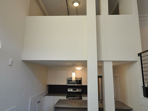 The double height ceiling allows views from the lofted bedroom above into the living room below. The apartment has a private washer and dryer, central heating and air conditioning. The unit is also furnished with an on demand gas fired hot water heater as well as a high efficiency boiler. Parking is available at an additional cost.
