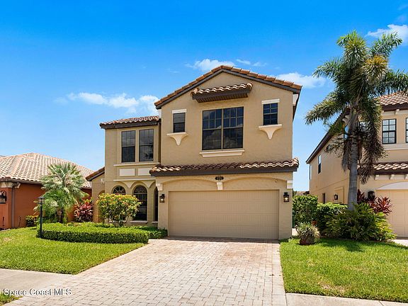 Luxury Living without the huge price tag.. This Spacious 4 bed, 3.5 bath home with office/flex space in the gated Montecito community boasts 3,144 sq ft of living space with 12 foot ceilings in the living area and massive outdoor screened lanai with electric shades. Built in 2008, this well-maintained & updated home features serene water views with cool breezes as backyard faces east! Tile flooring downstairs, real wood upstairs, hurricane shutters on all windows/doors,. Recent updates include Bosch kitchen appliances (2024), interior/exterior paint (2023), duct cleaning (2024), whole house water softener (2023), water heater (2022), HVAC (2019) X2, and gutters (2019). Also enjoy motorized shades on the downstairs sliders, a bright open layout, & new modern light fixtures. Montecito offers resort-style amenities including a pool, gym, clubhouse, and more—all just a few blocks from the beach, and top-rated schools. Don't miss this move-in ready gem in the heart of Satellite Beach for this amazing price per sq ft.