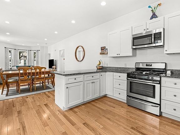 Inviting peninsulaShaker cabinetsTall windowsHigh ceilingsGranite countersNatural lightOpen-concept living space