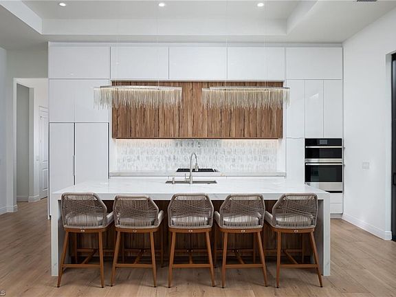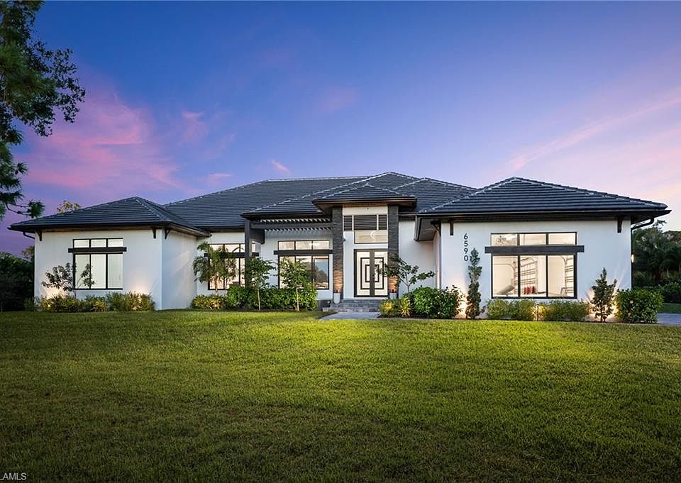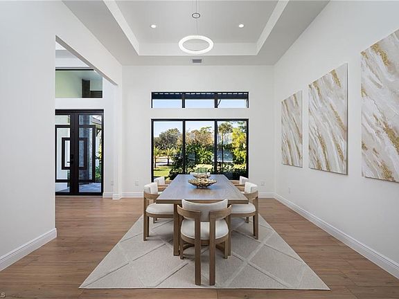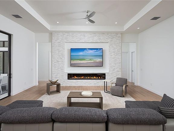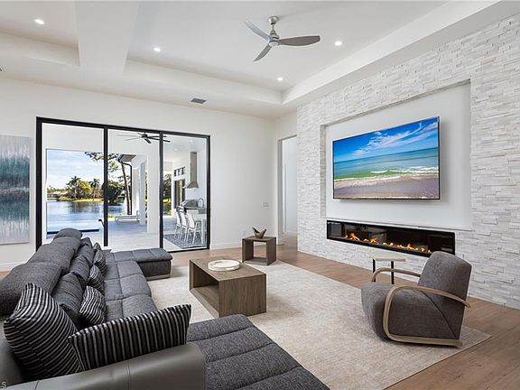 Elevated on a private, oversized estate lot, this newly constructed lakefront residence offers dramatic, uninterrupted water views and sophisticated contemporary design in the heart of Naples. Thoughtfully crafted with an open layout, the home showcases five spacious bedrooms plus a dedicated den, five modern baths, and an expansive four-car garage, all seamlessly tailored for both comfort and refinement. Step inside to light-filled interiors anchored by panoramic lake vistas through floor-to-ceiling sliding glass, creating effortless flow between living, dining, and entertaining areas. The gourmet kitchen features custom cabinetry, sleek stone surfaces, and a striking waterfall island, all opening to elegant gathering zones and refined dining spaces. The living room centers around a stunning stacked-stone fireplace wall, while high tray ceilings and designer fixtures enhance the sense of grandeur throughout. Transition seamlessly outdoors to a magnificent covered lanai with a summer kitchen, dining spaces, and multiple lounging zones, overlooking a breathtaking infinity-edge pool that blends flawlessly into the sparkling private lake. Manicured lawns, lush tropical landscaping, and tranquil water vistas provide a sanctuary for relaxation or entertaining, all framed by sunrise and sunset reflections across the water. Ideally situated just moments from Naples’ world-class beaches, premier golf clubs, upscale shopping, and fine dining, this estate offers the ultimate retreat for discerning buyers seeking unrivaled privacy, beauty, and lifestyle. Discover the pinnacle of lakefront living, where elegance, exclusivity, and Naples luxury converge in one extraordinary home.