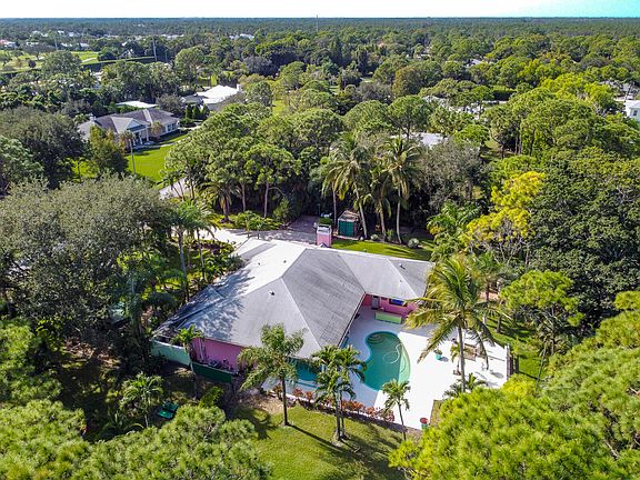 REMODELERS DREAM. CBS 3BR/2.5BA/2-car garage pool home in most coveted location. Lush1.15-acre fenced and gated lot on paved road. Split floorplan with extra high ceilings throughout. Separate living and family rooms, open kitchen, wood-burning fireplace, wet bar, formal dining room, and oversized laundry room. The master bedroom overlooks the pool and features walk-in closets and a master bathroom with dual sinks, separate Jacuzzi tub and walk-in shower. The pool area features a spacious covered porch, summer kitchen, and oversized pool deck - perfect for entertaining. Large gated concrete driveway with an extra paver parking area perfect for a boat or RV. Priced at land value and location only. Strictly AS-IS. 3,700 watt solar system. This home is ready to be remodeled to your taste! Palm Beach Country Estates features quiet country living with no HOA, city water, and close proximity to area amenities such as Alton Town Center and Abacoa.