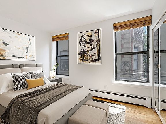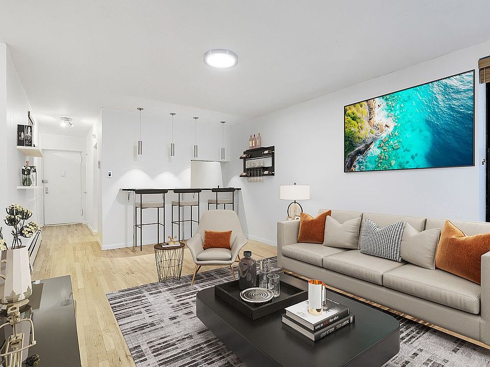 The apartment's large, renovated chef's kitchen features Frigidaire appliances, including dishwasher, and a charming pass-through to the spacious granite breakfast bar the opens into the 18.5 X 12 living room. Apt 3G has an elegantly updated bathroom with recessed lighting and a deep-soaking tub, and two "true" bedrooms, each of which fits a queen bed and a large closet.