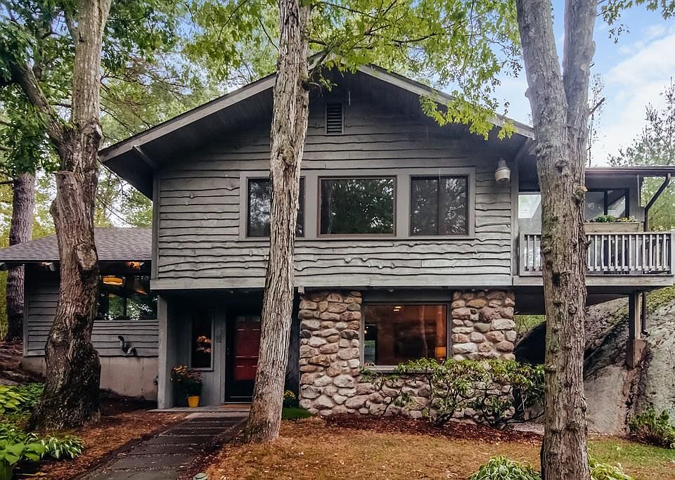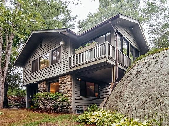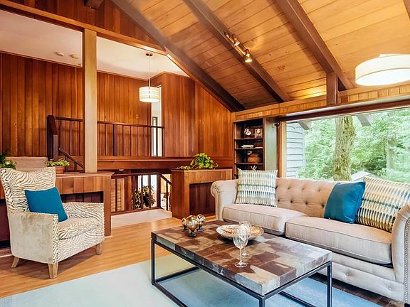 This gem has been polished to embrace its mid-century modern design. Originally built in 1962, the builder/designer of the neighborhood built this home for himself taking special advantage to position this home within its unique setting. Perched amongst a large rock formation and mature trees, this tri-level home has lots of wood detailing, large windows and private yard. The owners have added new carpet, fixtures and freshened the landscape to highlight the home's special period details. On the first floor there is a good size family room and eat in kitchen with fireplace and sliders to a large deck perfect for entertaining. The living room is set off on its own but open to the first and 2nd floor with cathedral ceiling, stone fireplace and built-ins that create a feeling of warmth and casual elegance. On the third floor you'll find 2 bedrooms and master suite with private bath, sunroom and walk-in closet. Great location close to shopping and commuter rail.