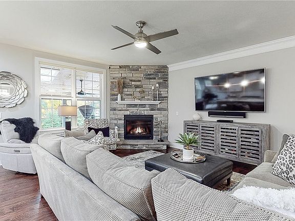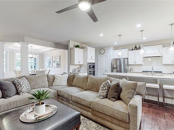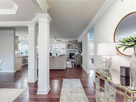 Welcome to this exquisite 2-bedroom, 2 full bath detached condominium located across from the 4th hole of the Jack Nicklaus Signature Golf Course. The welcoming front porch invites you to walk through the front door into the open foyer. From the foyer you are able to appreciate the open and spacious floorplan, large windows, crown molding and beautiful wide plank wood floors. The formal dining room features decorative columns, large windows, a tray ceiling, picture frame wainscoting and a gorgeous light fixture/ceiling fan combination. The dining room opens to the well-appointed eat-in kitchen complete w/ white cabinetry, granite counters, a large island, pendant lightning, tile backsplash, a pantry, stainless appliances. The dinette area is adjacent a lovely sitting room. A home office is accessible from the sitting room w/ French doors. The warm and welcoming family room features a stone floor to ceiling gas fireplace. The primary bedroom features a large spa like bath with a ti