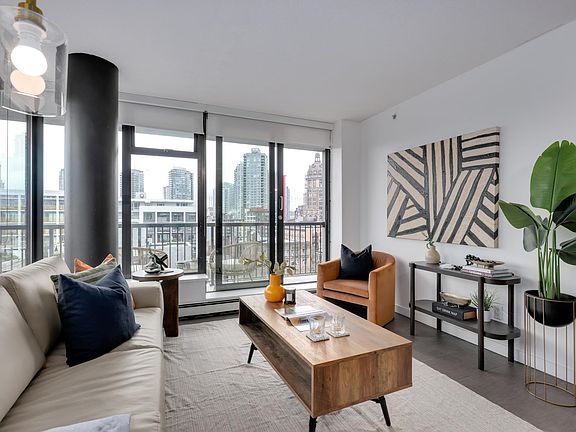 Welcome to 66 West Cordova by Westbank, a boutique, worry-free concrete building in the heart of Gastown. This bright 2-bedroom, 2-bath corner home features a stunning custom kitchen renovation with premium upgrades throughout. Enjoy SE-facing floor-to-ceiling windows, abundant natural light, and cityscape views from your wrap-around covered balcony. Strata fees include heat and hot water, with easy in-suite laundry hookup and rental parking available. The building offers a rooftop patio with panoramic water, mountain, and city views, plus a gym, BBQ area, and party room. Pets and rentals (min 30 days) allowed, steps from cafés, markets, and transit in vibrant Gastown.