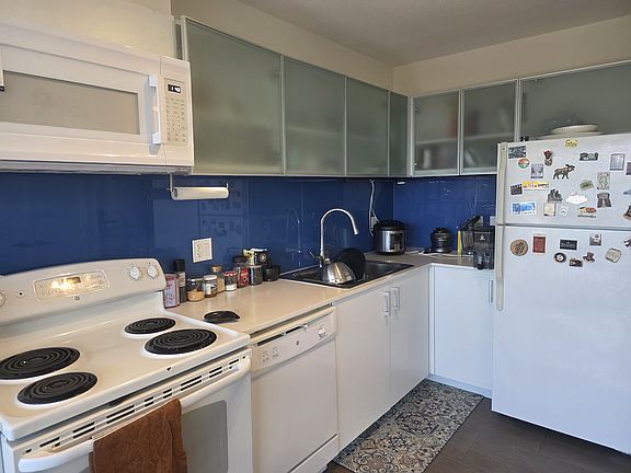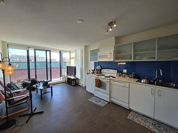 Full white appliance packageStriking blue backsplashLarge east facing balconyWell-maintained mid-rise building