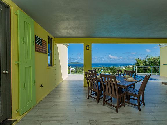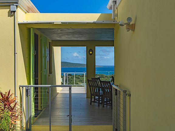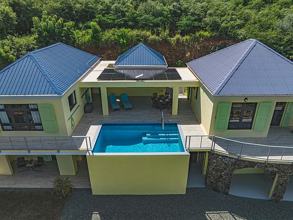 Modern 3BR/3BA East End home with expansive Buck Island & sea views and a private 12X18 saltwater pool. Over 3,500 sq. ft. of bright, open living space plus a separate lower-level guest suite with full kitchen. Completed in 2021 with reinforced cement, PGT impact windows, and split A/Cs throughout. Includes solar panels & battery back up, oversized one-car garage, workshop, storage. 2 cisterns, custom mahogany kitchen w/ quartz countertops , Travertine tile throughout interior, porcelain tile outside. Large .99 acre gated parcel with several varieties of fruit trees. 20 ft storage container also included. Sought after location close to beaches, restaurants, resorts, and the St. Croix Yacht Club.