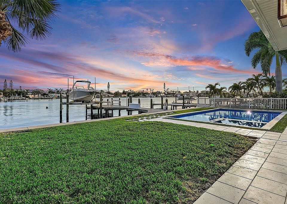 *This property did experience flood damage from hurricane Helene* Currently accepting CASH offers only! This home can effortlessly be restored back to it’s pre-hurricane glory with the assistance of SunBay Builders. Even with damage you can appreciate the beauty of this home and the meticulousness of its owners. Volume ceiling and well thought out floor plan will be sure to captivate you. Living room and foyer ceilings are beautiful Pecky Cypress. Floor plan currently established for 3 large bedrooms (two with en-suite bathrooms), 3.5 bathrooms total, and a designated office. Kitchen upper cabinets are intact and lowers can be ordered to match seamlessly. Why start completely from scratch when you can take advantage of what was recently completed prior to the hurricane. Stunning South West exposure and grand views of Boca Ciega Bay offering a front row view of 4th of July and NYE fireworks from the comfort of your dock. Walking distance to the beach and easy access in an out of Paradise Island avoiding the congestion of Gulf Blvd. All Major mechanicals are in working order and are newer including but not limited to the roof, PGT Win Guard windows and doors. New Seawall. Edge Marine Dock with 16k Neptune lift. Beautiful custom pool with hot tub (all operational) and Shellock pavers . 1k lbs propane tank for whole house operations. Plumbing and transfer switches for generator in place and ready (no generator currently installed). Custom Living room and foyer ceilings. All outdoor lighting was serviced and operational. Much of the home was saved including Bathroom shower stalls and tiling due to swift actions taken by the Sellers. Home has undergone the cut out and removal of the damaged materials. Home has been professionally cleaned. Images of current state and images pre-hurricane are available. Come see why so many choose to call Paradise Island home. A truly captivating haven for those who crave the perfect blend of boating and coastal lifestyle in Treasure Island