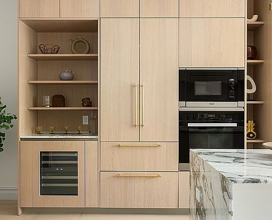 A gracious vestibule with restored original entry doors, coffee-brown marble slab flooring, and designer wallpaper sets the tone, leading into the parlor level where soaring ceilings over ten feet high and 10-inch-wide white oak floors establish a warm, modern-classic aesthetic. The sweeping living and dining space features an original decorative fireplace and flows seamlessly into a custom eat-in kitchen. Anchored by a built-in banquette breakfast nook, the kitchen is finished with Calacatta Vagli marble countertops, integrated cabinetry, and a full suite of Miele appliances—opening directly to a west-facing deck and tranquil garden.