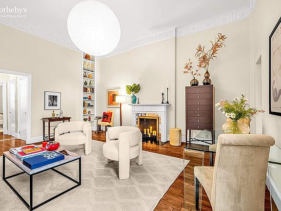 Twelve-foot ceilings crown the space, while hardwood floors, period moldings, and a ceiling medallion lend both character and quiet grandeur. At the heart of the room, a decorative fireplace draws the eye with a sense of visual balance. The scale of the windows and ceiling height creates a dramatic and harmonious composition.