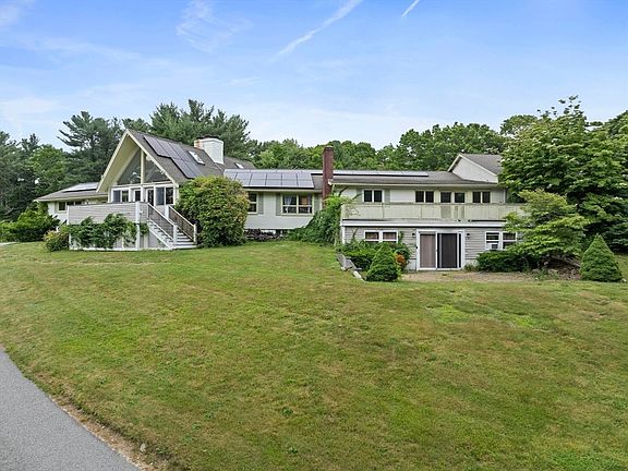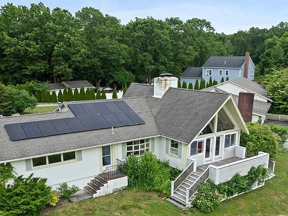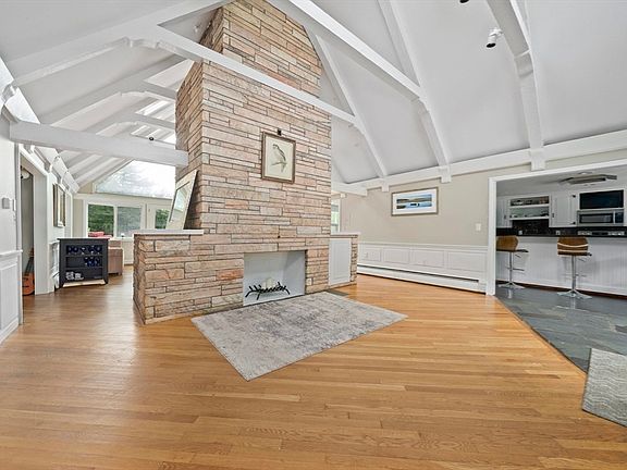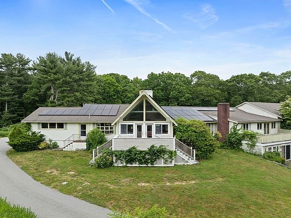 This 6 bdrm 4 1/2 bath home has 5 fireplaces, and an open floor plan great room under a beamed cathedral ceiling with a central chimney fireplace with column clad in stone and a large front to back kitchen. A connecting breezeway/mudroom from the 2 car garage leads to the kitchen that overlooks the private backyard landscaped with bird friendly plantings. The 1st floor master bedroom features a large private balcony and luxurious bathroom. The lower level hosts a finished basement offering a spacious game room with a brick framed wet bar, family room, dedicated laundry room and additional rooms for guests, media room, and a home office. A 7 car garage, once a helicopter hanger and a newly refurbished In-law apartment exists with a separate guest house on the property with its own septic and heating system that is gated w/ a pool attached (needs TLC). Solar panels run the main house and cottage. New electrical panel, New heating system and revenue generating income.