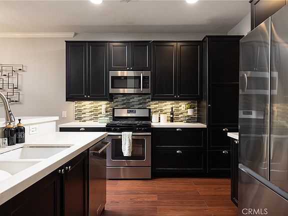 Welcome to this exquisitely upgraded Ladera townhome, perfectly situated in the highly sought-after, FHA/VA-approved community of Chambray . Step inside to a sun-drenched, open floor plan featuring beautiful wood laminate flooring, crown moldings in the family and dining rooms, and recessed lighting throughout the downstairs, with a cozy fireplace as a focal point in the family room. The gourmet, renovated kitchen is a chef's dream, boasting pristine quartz countertops, a gas range, a water filtration system, a subway tile backsplash, and matching stainless steel appliances. A convenient small office space and a half bath with tile flooring and a built-in vanity are also located on the main floor. Upstairs, you'll find laminate flooring and recessed lighting, along with all the bedrooms, including a primary suite that features dual sinks in the bathroom and a walk-in closet. The hall bath on this level also has tile flooring. This residence is equipped with central AC/Heat, dual-pane windows, a Nest system for smart climate control, and a fire sprinkler system for added safety. The attached garage is EV-ready with a charger and includes overhead storage racks for extra space. Beyond the home, you can embrace the ultimate resort-style living with Ladera Ranch's vast array of amenities, such as a waterpark, sports and skate parks, several clubhouses, tennis courts, scenic trails, a community garden, and a dog park, all situated directly across the street from a shopping center with Albertsons, a Starbucks, and dining options. The entire community has been recently re-piped, and this exceptional home is also within the attendance boundaries of highly-regarded, award-winning Chaparral Elementary and Ladera Intermediate Schools, making it the perfect place to welcome home.