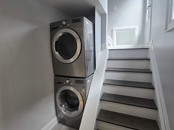 Occupancy for the 1,127-sqft 2-bedroom, 1-bathroom basement unit of a detached house. Central heating and AC. Utilities excluded (40/60 split). Main-floor separately tenanted. Smoke and CO2 alarms newly installed. Included appliances: fridge, range hood, stove, and microwave. Building amenities include: laundry facilities, driveway and backyard.