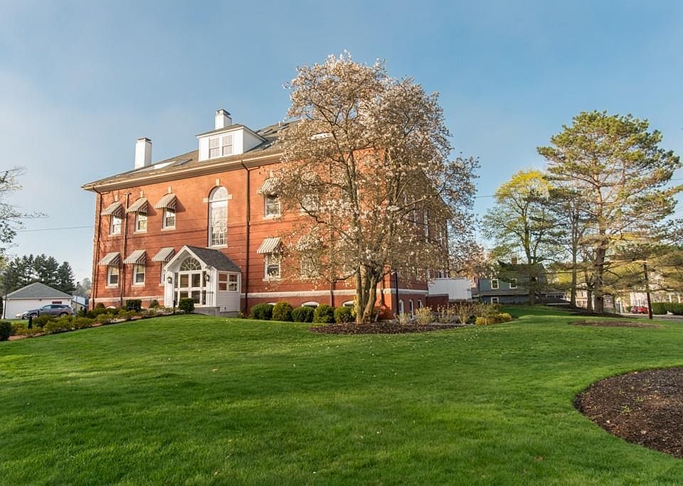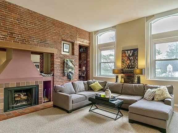 This two bedroom sophisticated loft style condo is located in the desirable Beverly Farms schoolhouse building and is near shops, restaurants, highway, commuter rail and beach! Soaring 12 foot ceilings, exposed brick walls and sunny interior. This 2nd floor south facing corner unit is in great condition. Updated kitchen with newer appliances and systems, spa quality master bathroom with radiant heat and additional 3/4 bath along with a wood burning fireplace. Other features include full size, in-unit laundry, deeded garage space, additional assigned parking, extra storage and elevator.