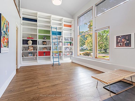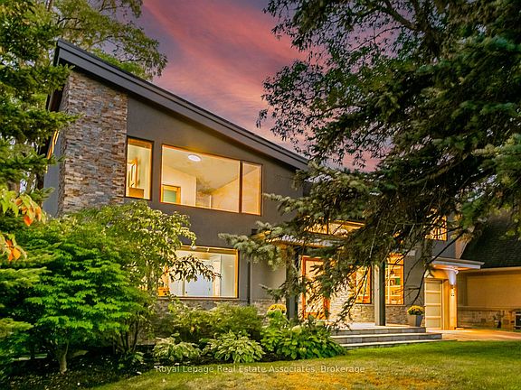 Designed by David Small and custom-built by Ravensbrook Custom Homes, this masterfully crafted residence offers approx. 6,500 sq. ft. of luxurious living space on a rare 75' x 150' south-facing lot in prestigious Mineola West. Step into a home defined by soaring ceilings, sleek design, and expansive windows that flood every space with natural light. Featuring 4+1 bedrooms, 6 bathrooms, and exceptional flow throughout, the open-concept main level includes premium oak hardwood flooring, in-ceiling speakers, and LED pot lighting. The custom Artcraft kitchen is a chef's dream, complete with Wolf, Subzero, and Miele appliances, quartz counters, and access to a stunning 3-season Muskoka Room with cedar finishes, slate flooring, and panoramic garden views. The dramatic living room impresses with 15' 8" ceilings, expansive windows, and a rolling ladder library wall. The family room features an 11' vaulted ceiling, floor-to-ceiling gas fireplace with quartz surround, and built-ins. Upstairs, discover a spa-inspired primary suite with custom drapery, his and hers walk-in closets, and a 5-piece ensuite with Neptune soaker tub and marble finishes. All upper-level bathrooms include Nuheat in-floor heating. The fully finished lower level offers radiant hydronic heating, a large recreation room with gas fireplace, above-grade windows, oversized entertainment wet bar, an exercise room, an additional bedroom, and full bath perfect for guests or extended family. A whole-home generator ensures you will never be without power. This is a one-of-a-kind offering located steps to Lake Ontario, the GO, trendy Port Credit village shops and restaurants and excellent schools.