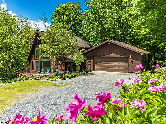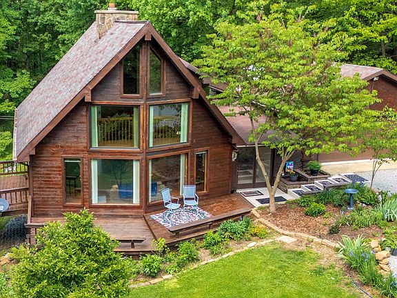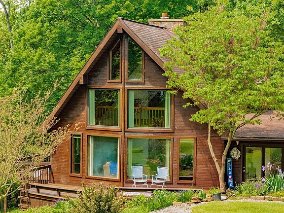 Find a perfect blend of serenity and comfort in this 2- bedroom, 2-bath house. With its rustic country feel, surrounded by woods, this lovely cedar chalet calls out to you. High ceilings, open concept floor plan, lots of natural light. Overlooking the great room is a loft with knotty pine ceiling for a reading nook or a cozy lounge providing a rustic feel and adding to its architectural charm. Primary suite on the second floor with en-suite full bath, large closet and a private deck. Hardwood floors in the great room and primary bedroom. Stone wall behind the wood burning stove for those extreme cold days in the winter. Office room with natural light overlooking a wooded backyard provides a serene and calming environment. Beautiful perennial garden and fenced in vegetable garden. Enjoy the deer, turkeys and native songbirds as you sip your morning coffee on any of the three decks. Brand new appliances, quartz countertops and custom oak trims in the great room and kitchen. New furnace and A/C, newer hot water heater. Gas range with its own propane tank. 2 car attached garage with a full attic. Enjoy the country feel close to town. Don’t miss out on this beautiful property. Taxes have homestead exemption.