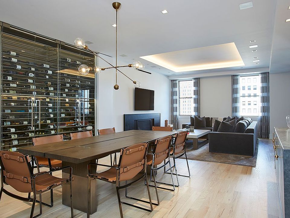 A true highlight of this home is the custom designed, climate controlled 700 bottle wine storage behind glass walls, making for a dramatic addition to the entertaining area of the loft. The whole apartment is wired with a Lutron Light system, integrated Sonos sound system designed by Audio Breakthroughs, and automatic shades with custom designed pockets. The laundry room includes a vented Washer Dryer. The entry closet, laundry and other storage areas feature custom designed seamless doors to improve the aesthetic. This home features exquisite lighting fixtures by Apparatus and Holly Hunt and ample storage.