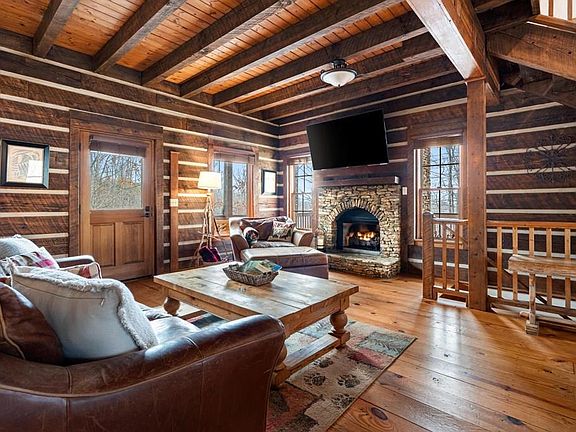 This stunning 3-bed, 3-bath cabin in the peaceful Wildflower community offers long-range, parkway-like views and rustic charm with modern comforts. The main level features a great room with a fireplace, custom rustic kitchen cabinetry, a dining area with a handcrafted table, a primary bedroom, and a recently renovated full bath. The walk-out basement is an entertainer's dream, complete with a living area with a fireplace, TV center, curated furnishings, and a WNC Billiards pool table. A bonus room and full bath add versatility. Outside, enjoy a hot tub and tranquil water feature. Wildflower offers a clubhouse with stunning views, a full kitchen, pool, gathering space, and exercise room. Conveniently located 23 minutes from Franklin, 30 minutes from Sylva, and within a short drive to Asheville, Atlanta, and Greenville airports. Don't miss this serene mountain retreat—schedule your showing today!